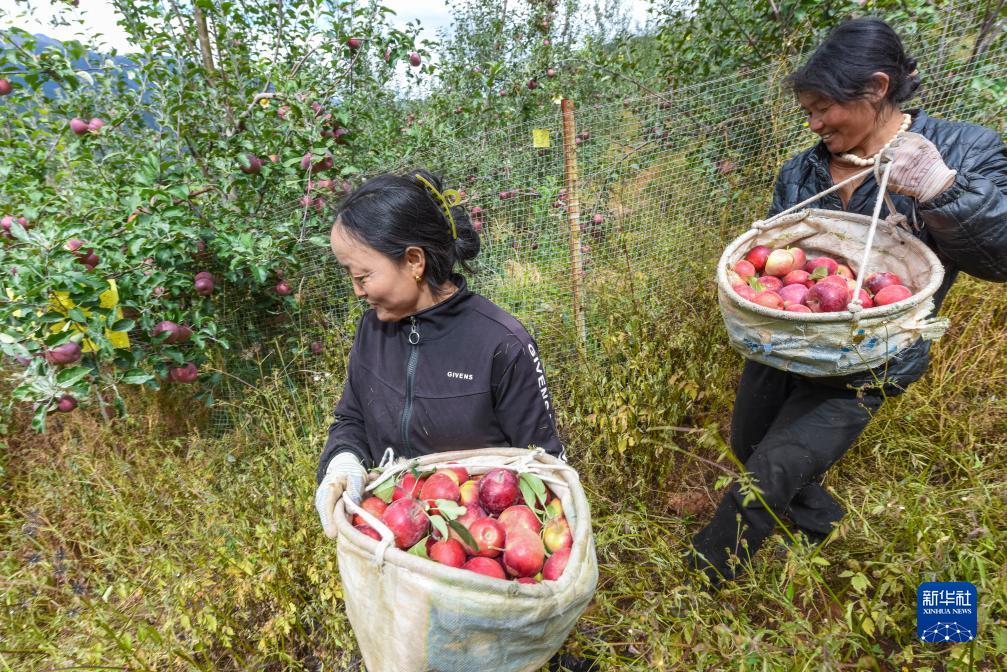 10月13日,在鄉城縣“蘋果+藏豬”種養循環現代農業園區內的有機蘋果種植示範基地,當地藏族群眾太(左)和洛絨抱着採摘的蘋果下山。