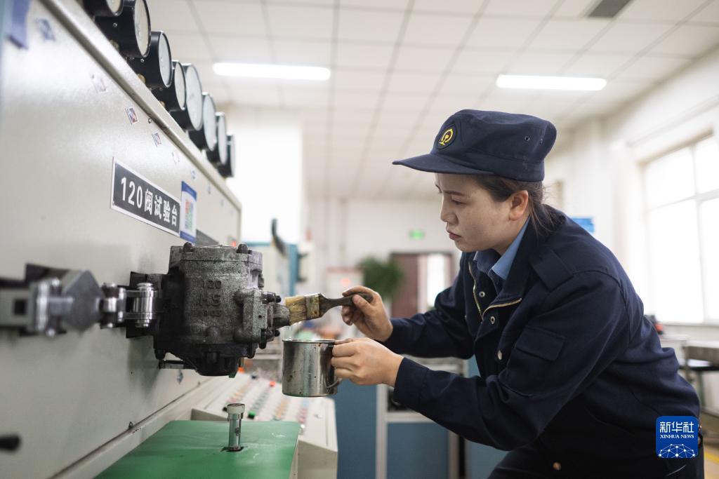 10月12日,在中國鐵路青藏集團有限公司西寧東車輛段制動班組,馬婷在120閥試驗時塗抹檢漏劑。
