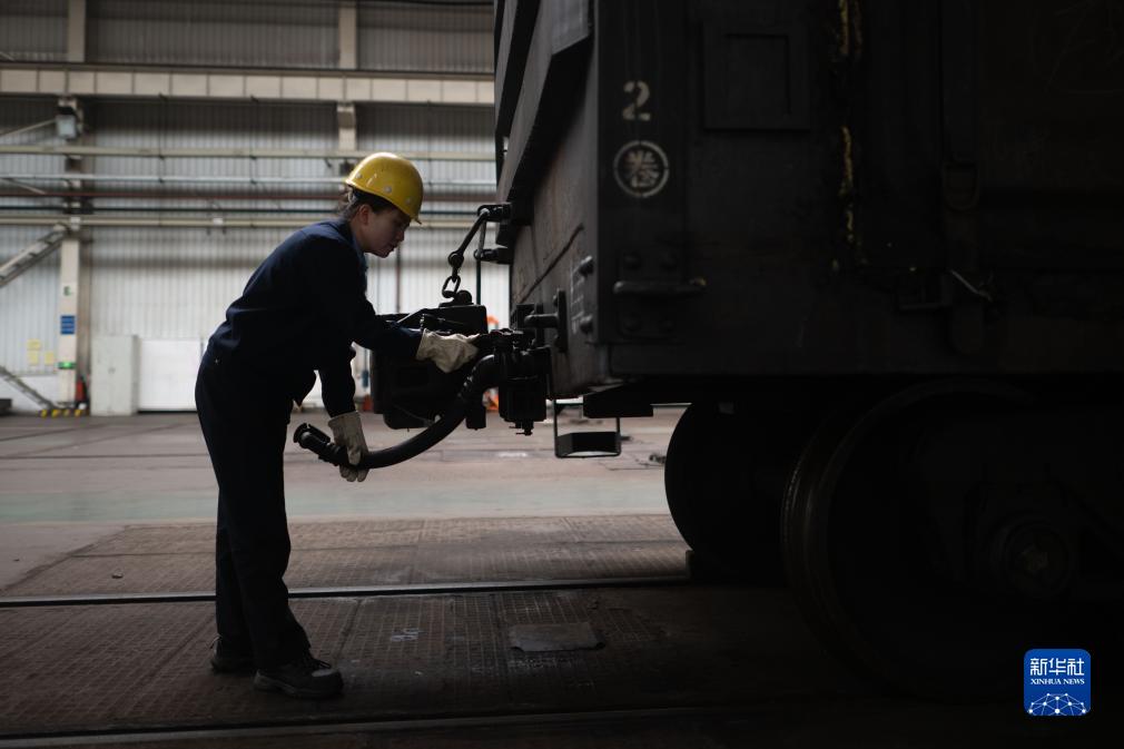 10月12日,在中國鐵路青藏集團有限公司西寧東車輛段制動班組,馬婷在檢查貨車車輛制動軟管。