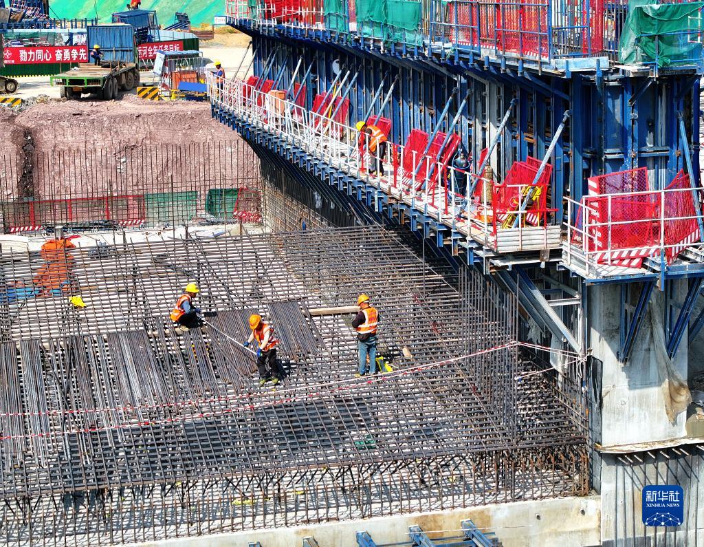 工人在平陸運河青年樞紐施工現場架設鋼筋(10月3日攝,無人機照片)。