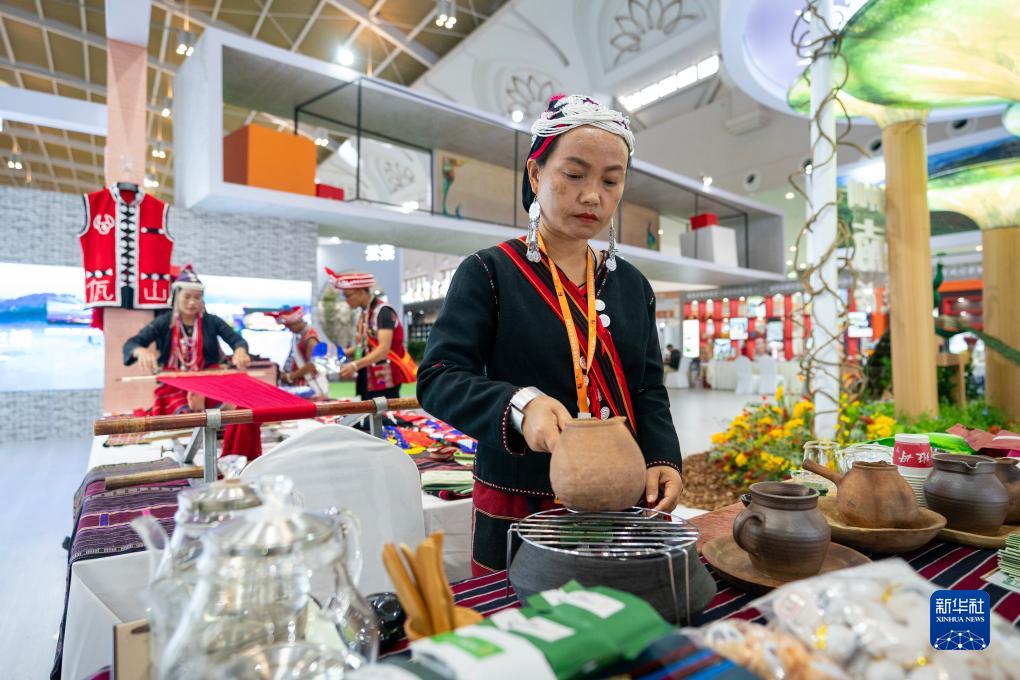 10月14日,參展商在第十五屆中國雲南普洱茶國際博覽交易會上製作烤茶。