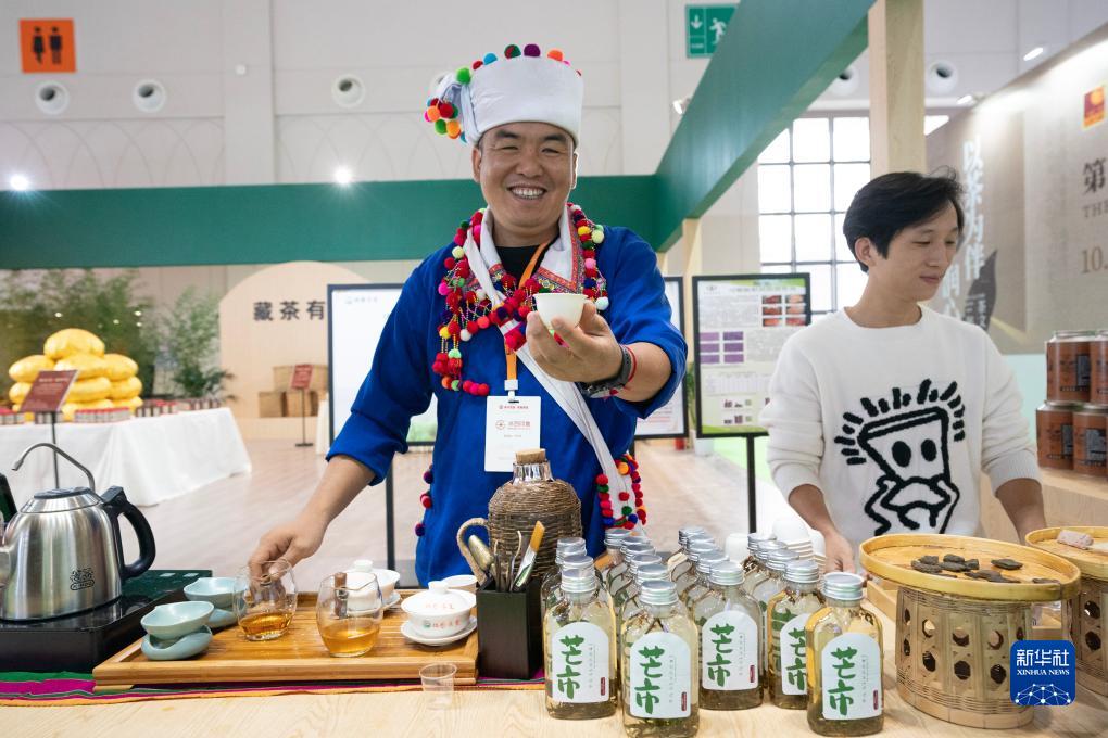 10月14日,參展商在第十五屆中國雲南普洱茶國際博覽交易會上邀請參觀者品茶。