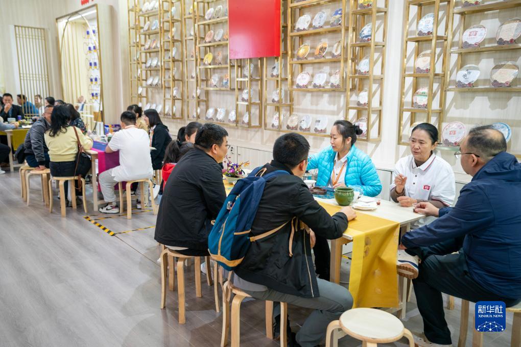 10月14日,參觀者在第十五屆中國雲南普洱茶國際博覽交易會上品茶交流。