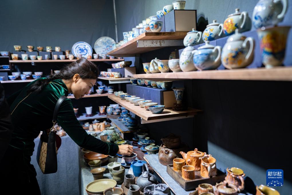 10月13日,參觀者在第十五屆中國雲南普洱茶國際博覽交易會上挑選茶具。