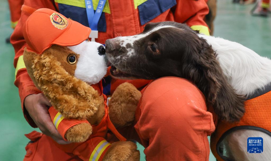 10月14日,在頒獎儀式上,一搜救犬好奇地嗅着消防搜救犬玩偶。
