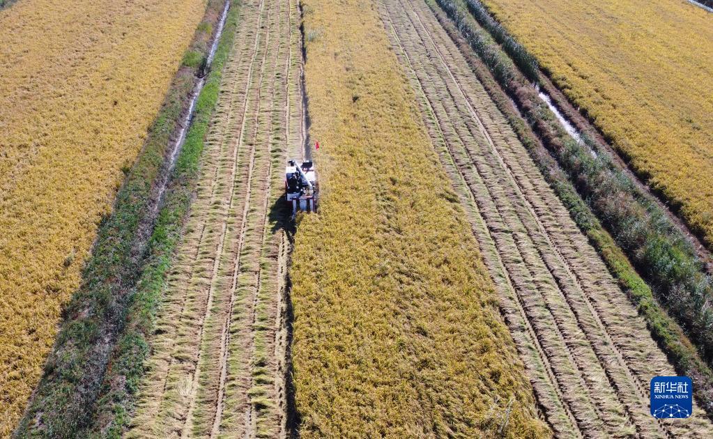 10月14日,收割機在天津市津南區小站鎮會館村小站稻核心種植區作業(無人機照片)。
