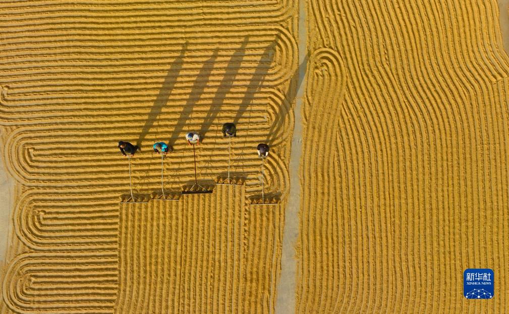 10月12日,在遼寧省燈塔市禾谷茂源水稻種植專業合作社,農民在晾曬收穫的水稻(無人機照片)。