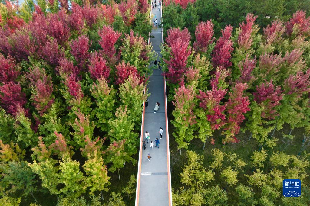 10月7日,市民在陜西西安雁南公園內駐足觀景(無人機照片)。