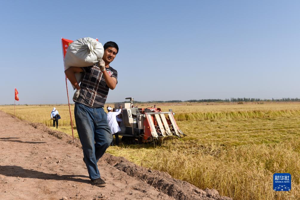 10月13日,新疆阿拉爾市測産田塊,工作人員在搬運測産稻穀。