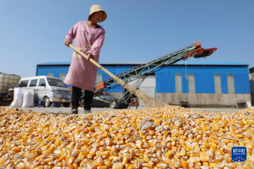 10月14日,河南省焦作市溫縣岳村街道西坡村農民在場院收晾曬乾的玉米。