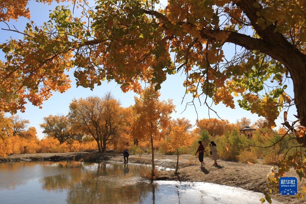 10月14日,游客在甘肅省敦煌市黃渠鎮胡楊林中賞景。