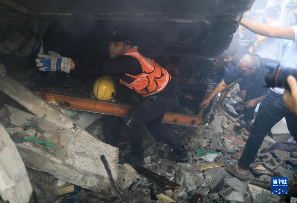 10月14日,在加沙地帶南部城市汗尤尼斯,人們在遭以色列空襲炸毀的建築中救援。