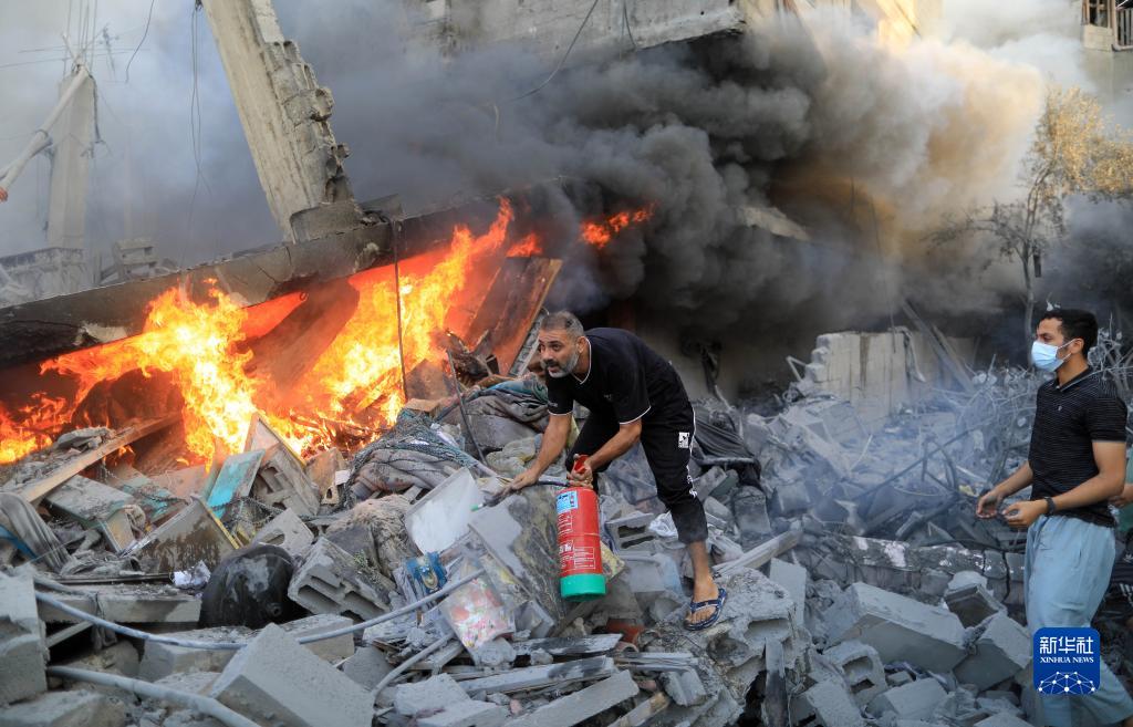 10月14日,在加沙地帶南部城市汗尤尼斯,一名男子在撲滅以色列空襲造成的火災。