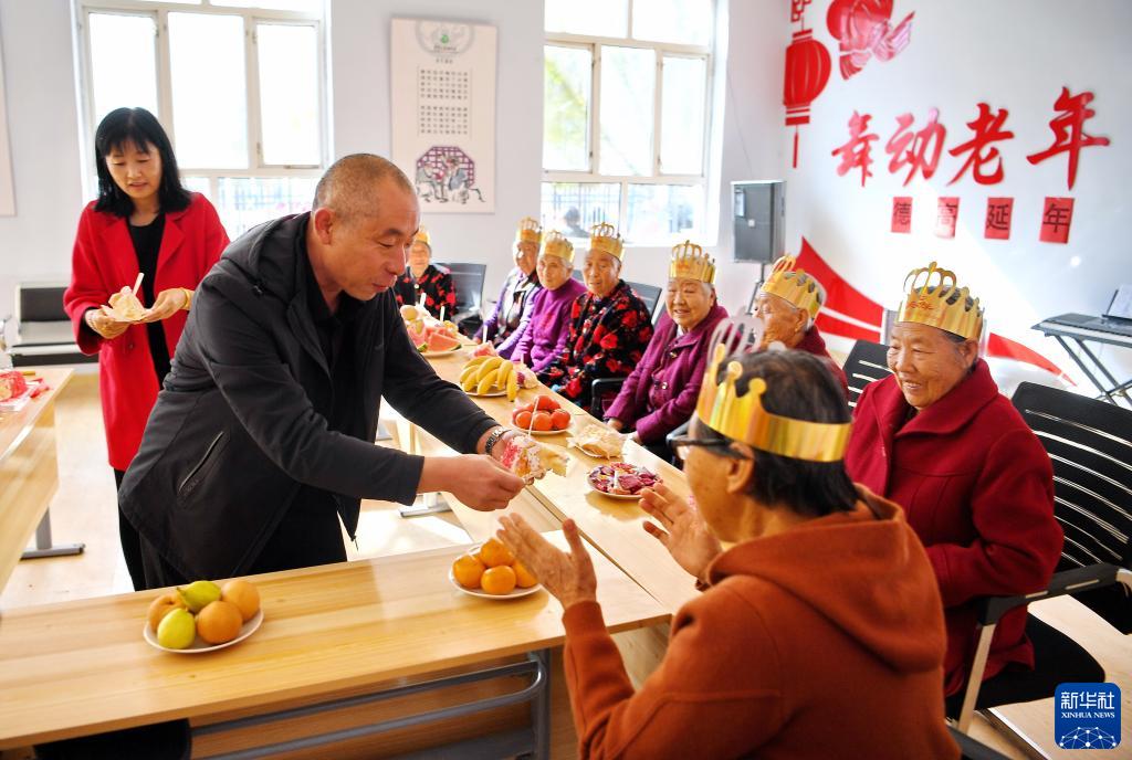 10月14日,河北省康保縣土城子鎮互助幸福院的工作人員為過集體生日的老人們端上生日蛋糕。
