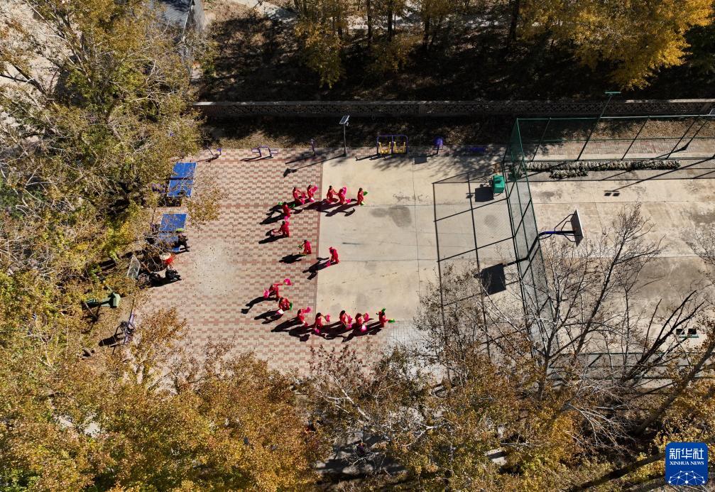 老人們在河北省康保縣土城子鎮互助幸福院內跳舞(10月14日攝,無人機照片)。