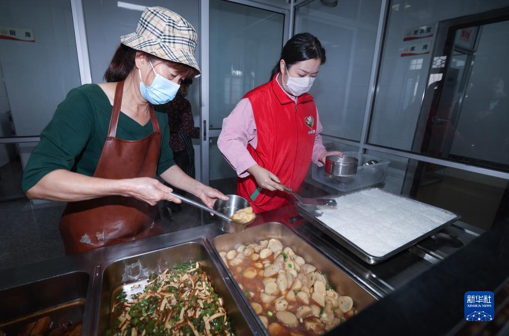 10月15日,在杭州市富陽區裏山鎮民強村老年食堂,工作人員給老人配餐。