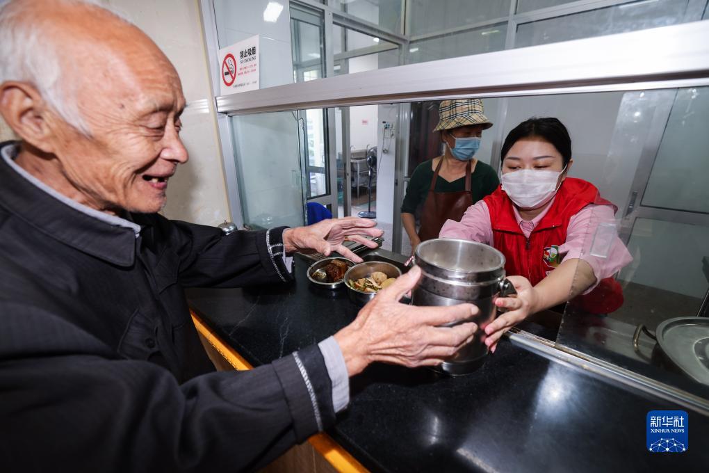 10月15日,在杭州市富陽區裏山鎮民強村老年食堂,黨員志願者給85歲的老人夏永建(左)配餐。
