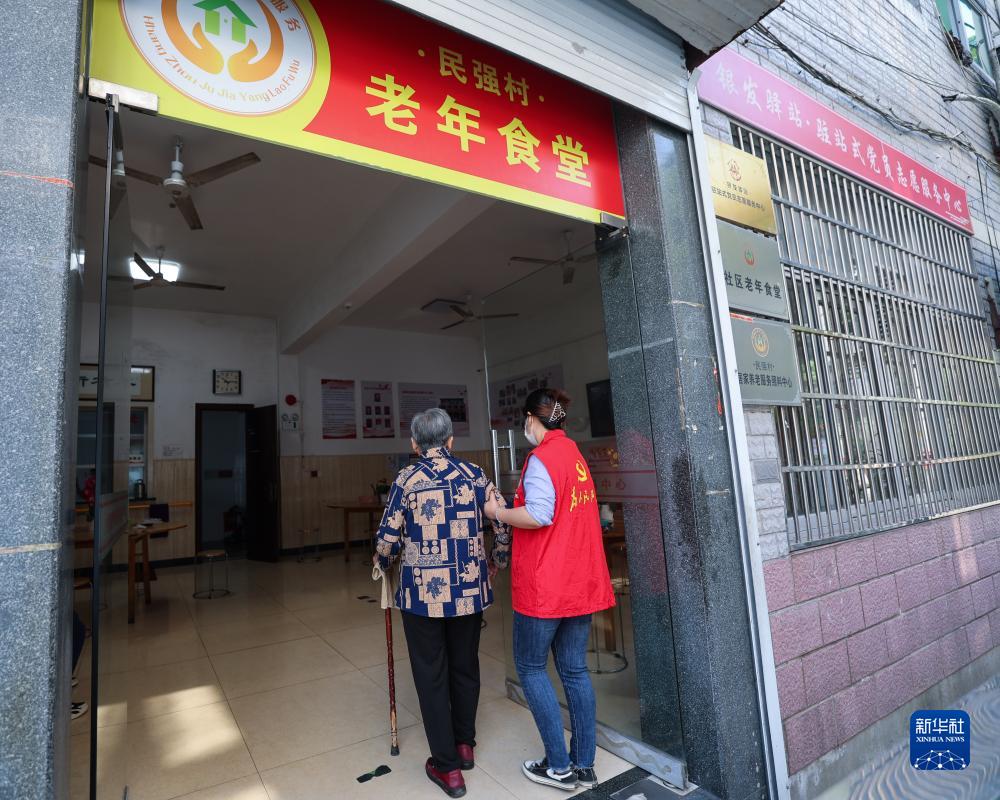 10月15日,黨員志願者扶着老人到杭州市富陽區裏山鎮民強村老年食堂就餐。