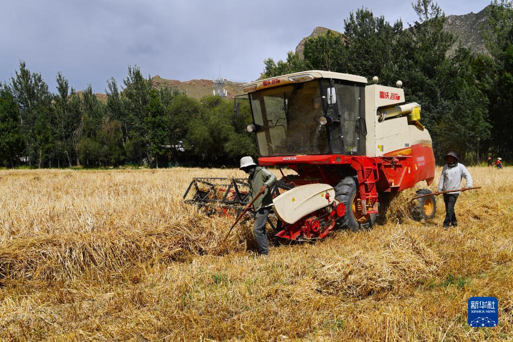 西藏曲水縣才納鄉白堆村村民在高標準化農田內收穫青稞(9月11日攝)。