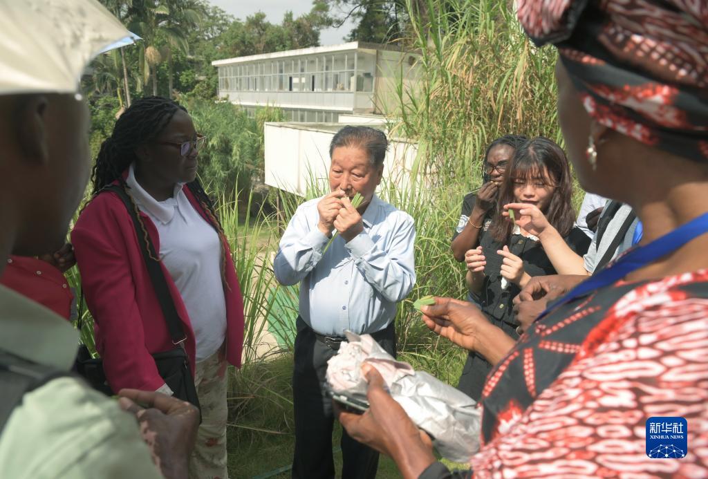 10月14日,在福建農林大學,林佔熺教授(中)向參加培訓的外國學員介紹巨菌草的生物學特性。
