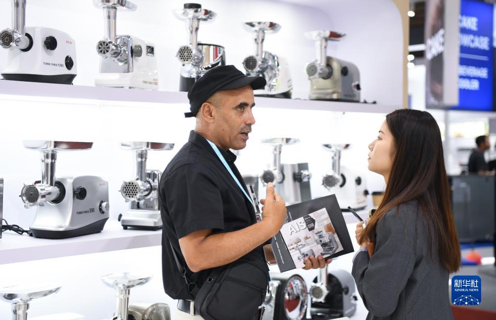 10月15日,一名外國採購商在一家小家電展&洽談業務。