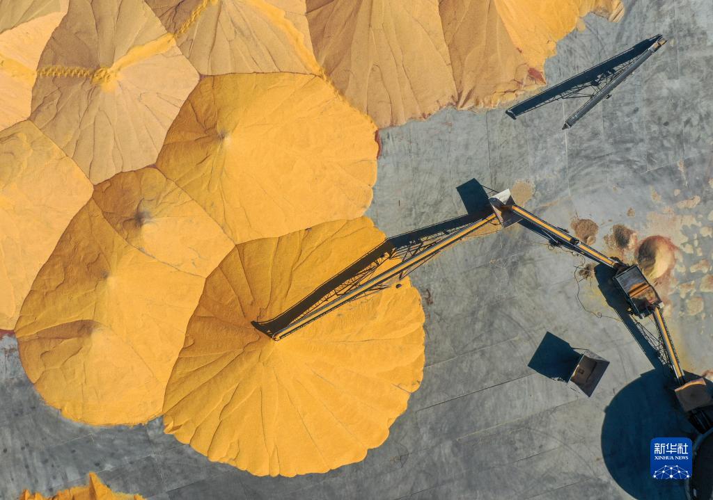 10月15日,在內蒙古通遼市科爾沁左翼中旗腰林毛都鎮一家“糧食銀行”,經過烘乾的玉米堆積如山(無人機照片)。