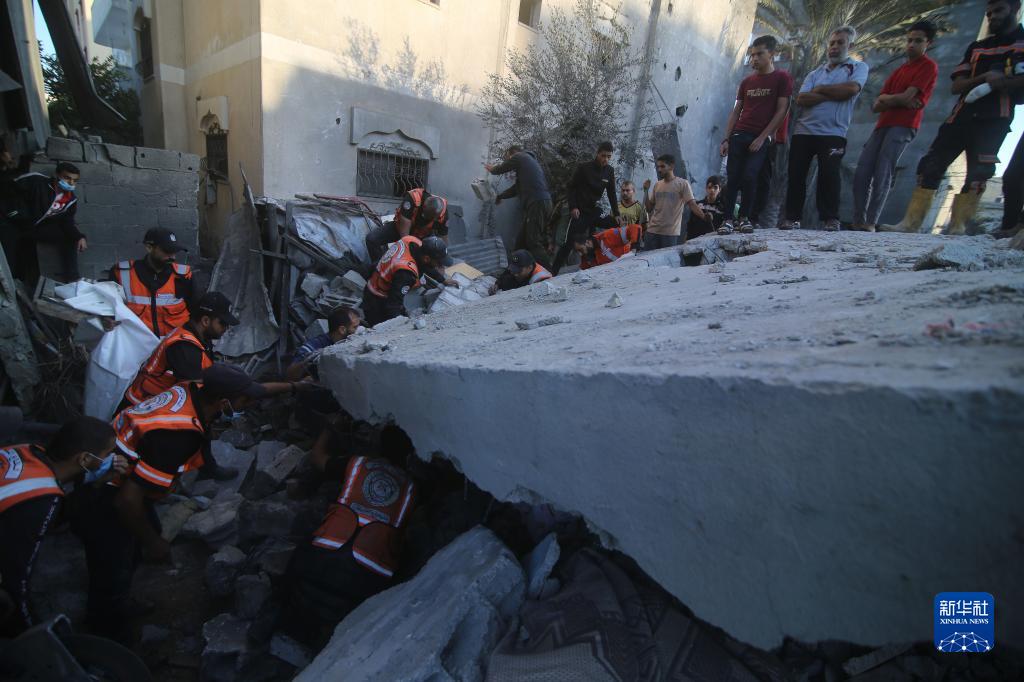 10月15日,在加沙地帶南部城市拉法,救援人員在遭以色列空襲後的受損建築中實施救援。