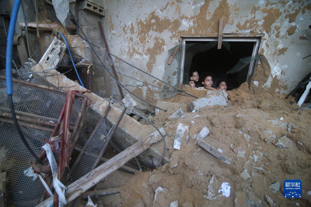 10月15日,在加沙地帶南部城市拉法,兒童在遭以色列空襲後的受損建築中向外張望。