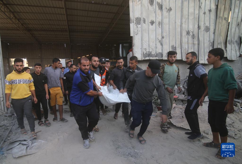 10月15日,在加沙地帶南部城市拉法,人們從遭以色列空襲後的受損建築中抬出遇難者遺體。