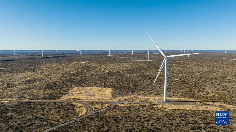 這是6月12日在阿根廷丘布特省馬德林港拍攝的羅馬布蘭卡一期風電場(航拍照片)。