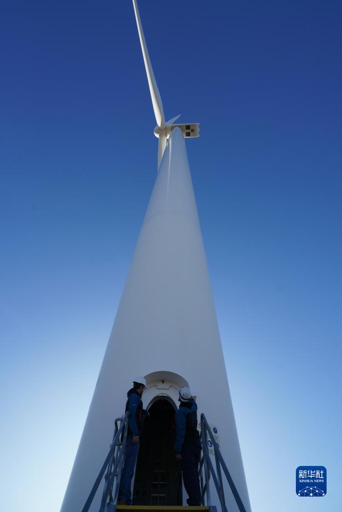 6月12日,在阿根廷丘布特省馬德林港的羅馬布蘭卡一期風電場,風機運維人員檢查設備運行狀況。