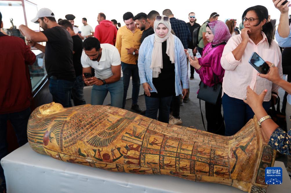 10月15日,在埃及明亞省考古現場,人們參觀彩繪木乃伊棺槨。