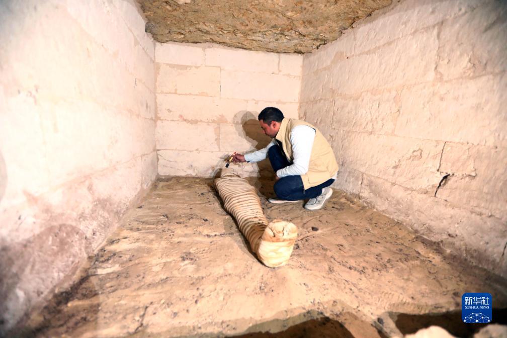 10月15日,在埃及明亞省考古現場,考古人員清理一座石鑿墓中的木乃伊。