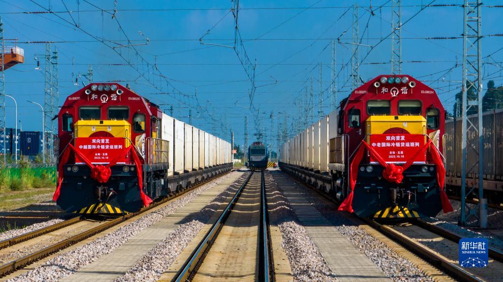 當日上午,兩列滿載着雲南特色果蔬的冷鏈班列,同時從雲南省玉溪市研和站駛出,1天后將分別抵達老撾萬象和越南老街,這標誌着中老、中越鐵路國際冷鏈貨運班列正式開通運營。