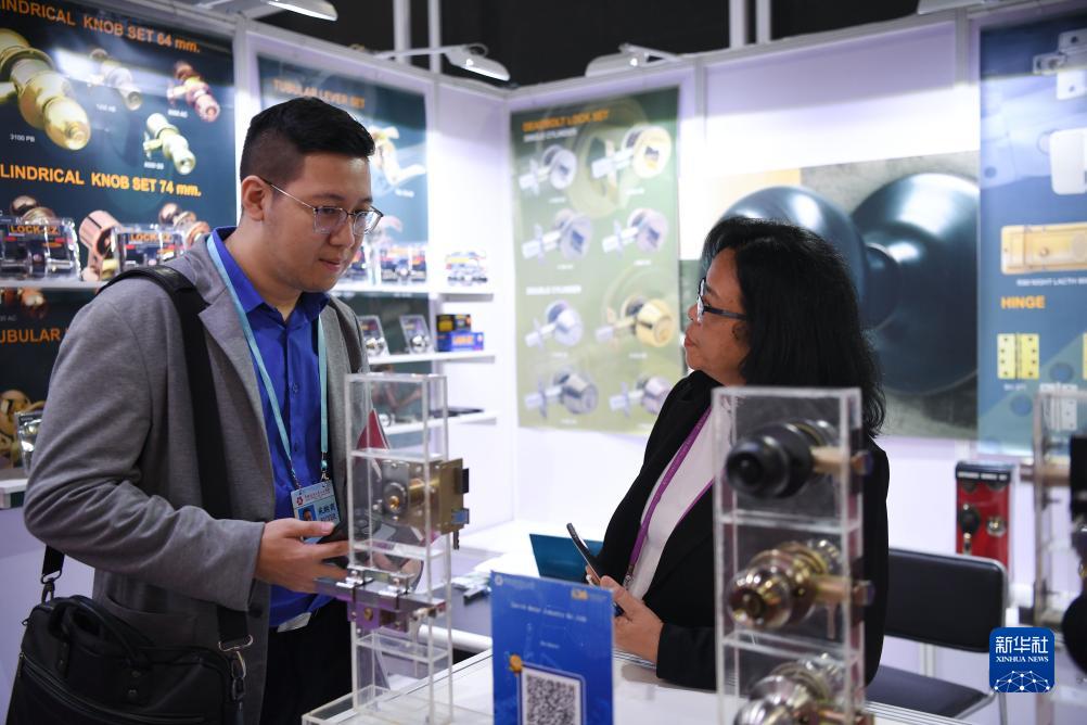 10月16日,第134屆廣交會上,進口展區的泰國參展商(右)與顧客洽談。