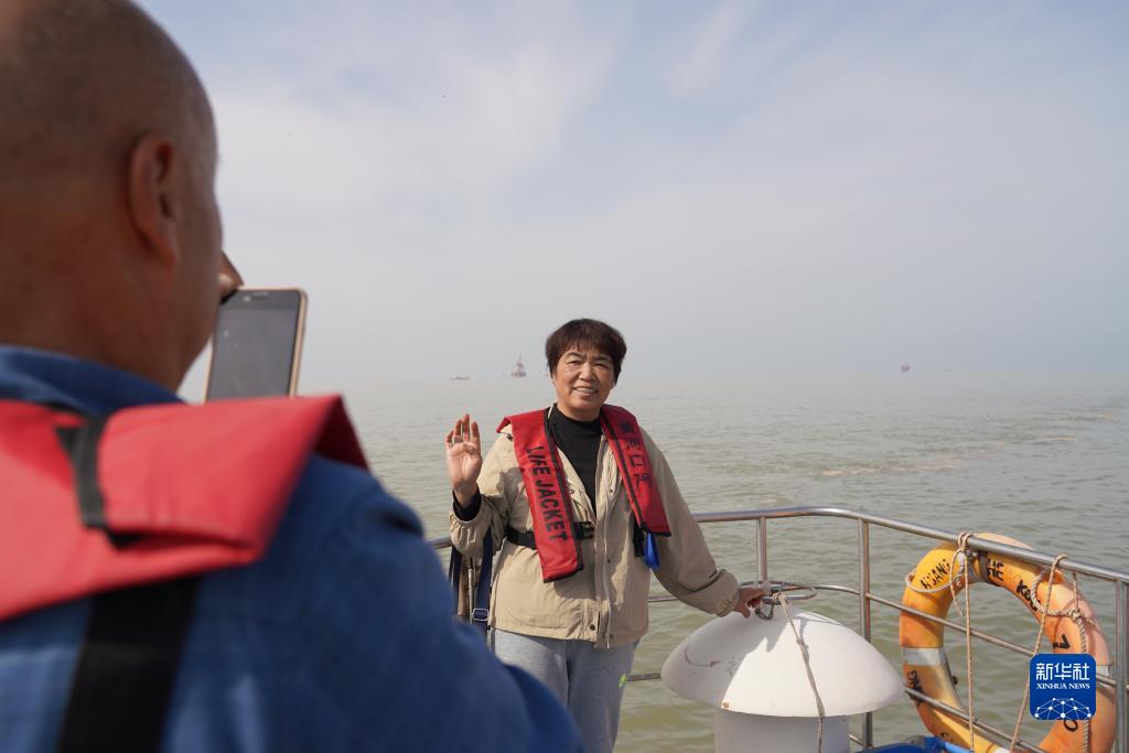 10月12日,在黃河入海口,游客在船上拍照留念。