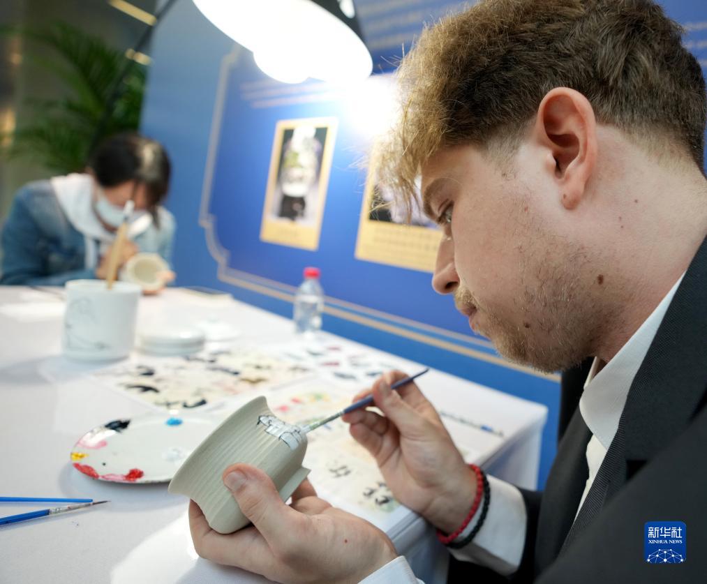 10月16日,在第三屆“一帶一路”國際合作高峰論壇新聞中心,來自匈牙利的記者體驗北京倣古瓷製作技藝。