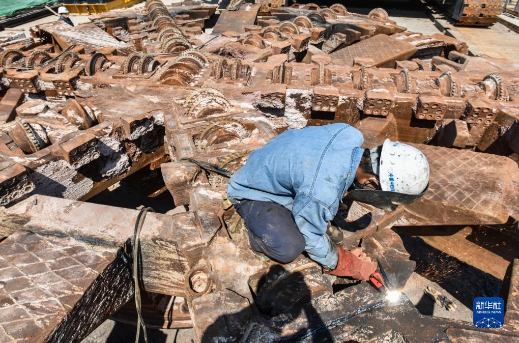 10月16日,施工人員為出洞的“開路先鋒1號”盾構機刀盤進行焊接作業。