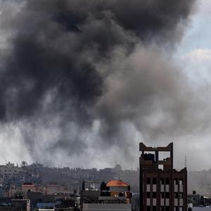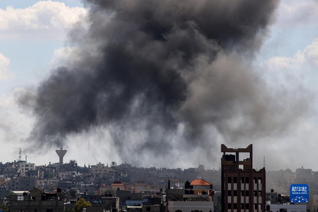 10月15日,加沙地帶南部城市汗尤尼斯的建築遭以色列軍隊空襲後升起濃煙。