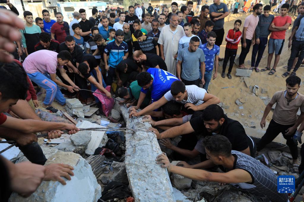 10月16日,在加沙地帶南部城市汗尤尼斯,人們在遭以色列襲擊後的建築廢墟中救援傷者。