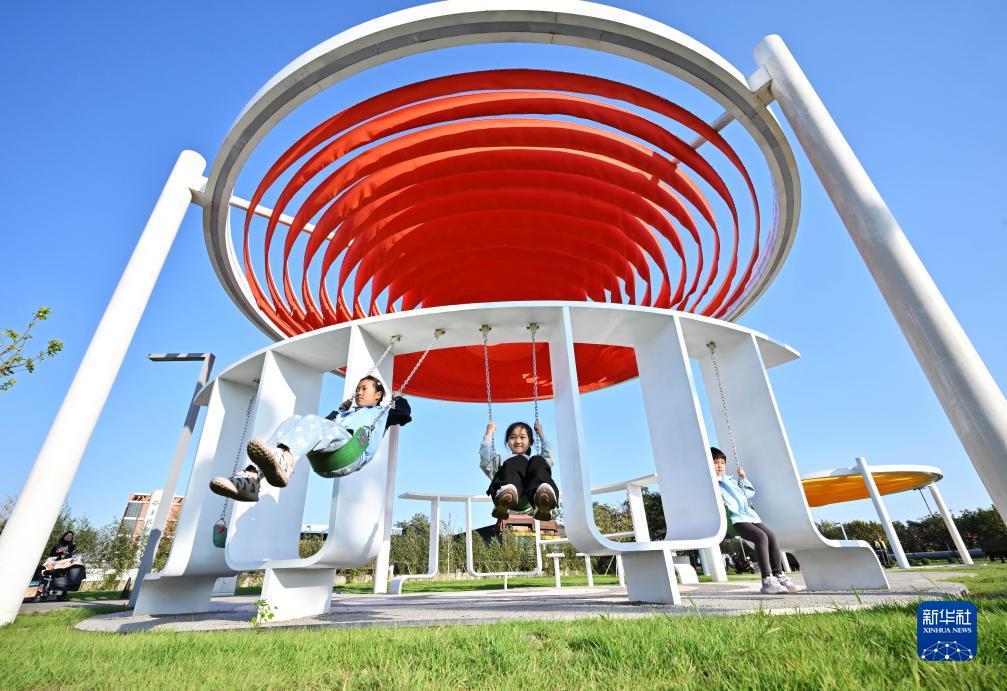 10月15日,小朋友在唐山市海港經濟開發區漣漪廣場盪鞦千。