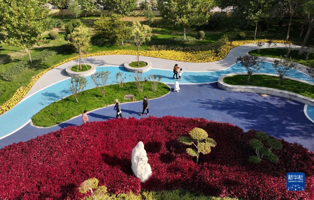 10月15日,市民在唐山市海港經濟開發區一處街角公園休閒鍛煉(無人機照片)。