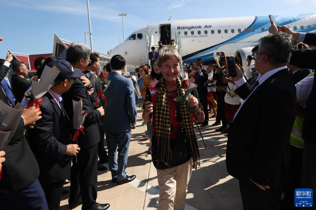 10月16日,在柬埔寨暹粒吳哥國際機場,首架進港客機乘客受到夾道歡迎。