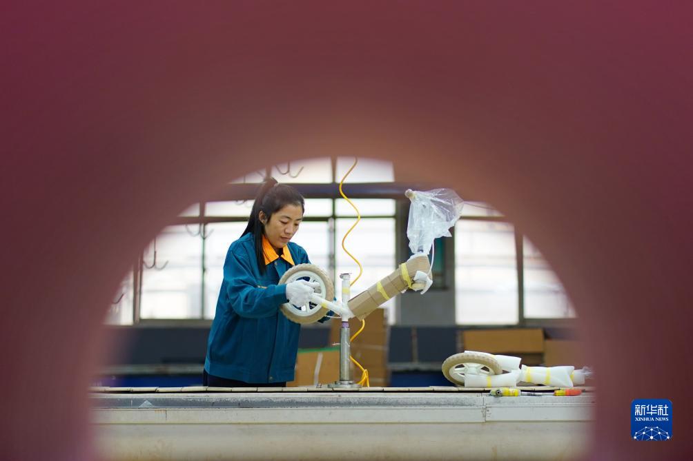 10月16日,平鄉縣一家童車生産企業的工人在組裝童車。