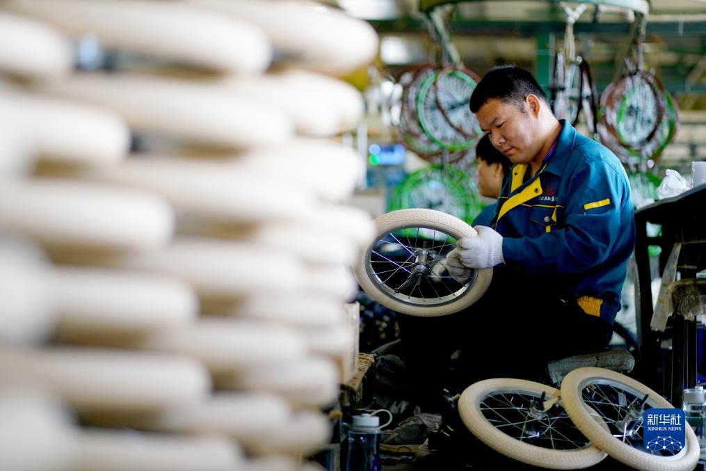 10月16日,平鄉縣一家童車生産企業的工人在組裝童車輪胎。