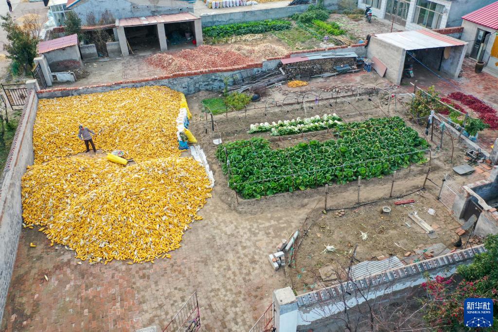 10月13日,通遼市科爾沁區豐田鎮車力花村村民在家中晾曬玉米(無人機照片)。