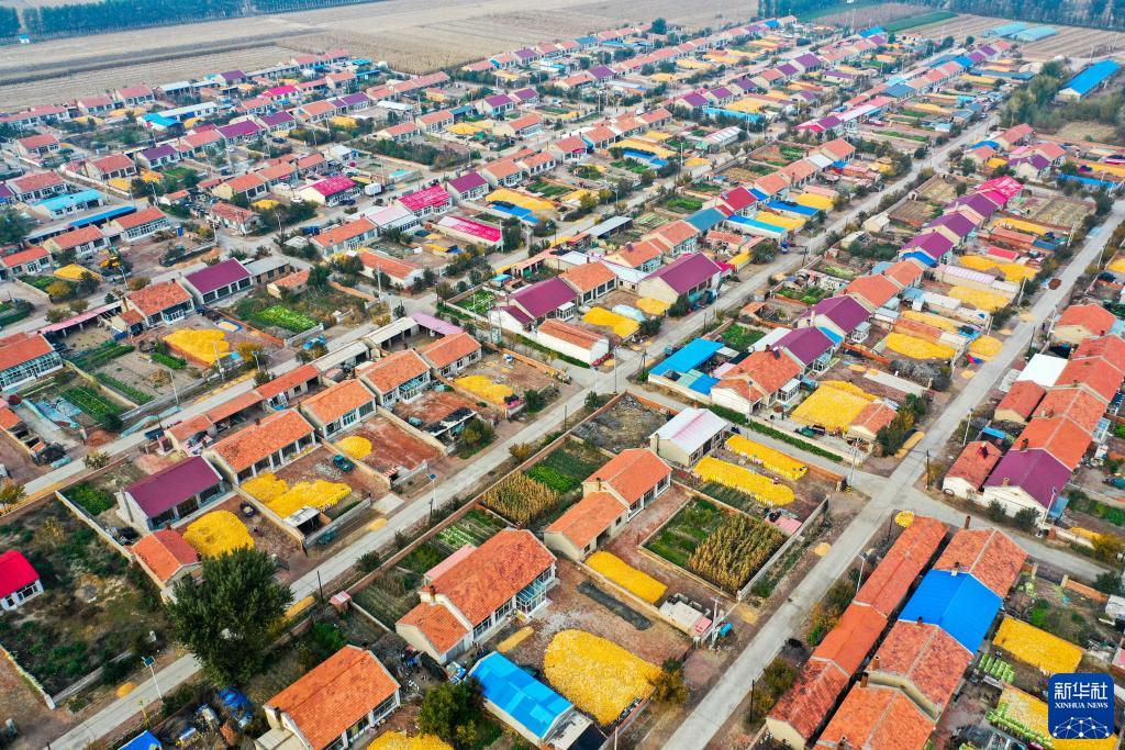 通遼市科爾沁區豐田鎮車力花村村民的小院裏處處晾曬着玉米(10月13日攝,無人機照片)。