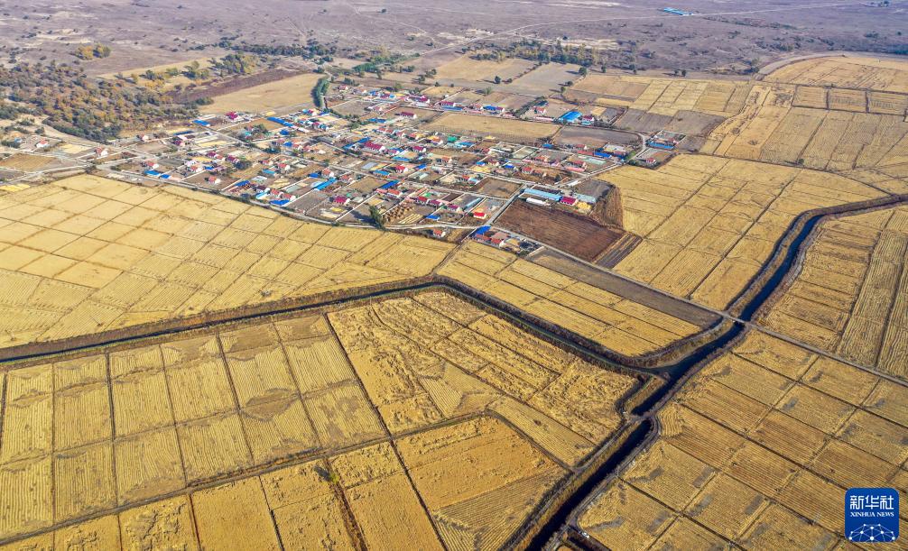 通遼市科爾沁左翼後旗金寶屯鎮套布海村水稻收穫過半(10月14日攝,無人機照片)。