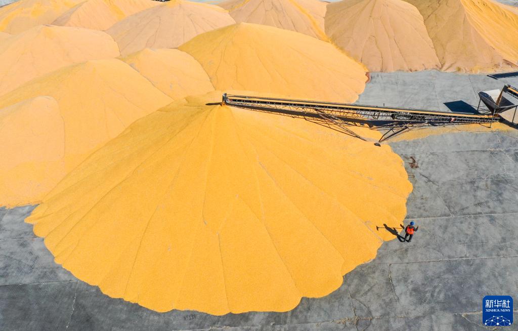 10月15日,通遼市科爾沁左翼中旗腰林毛都鎮收糧站的工人在整理烘乾的玉米堆(無人機照片)。