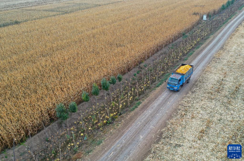 10月13日,通遼市科爾沁區錢家店鎮前西艾力村村民駕駛農用車將收穫的玉米運回家(無人機照片)。
